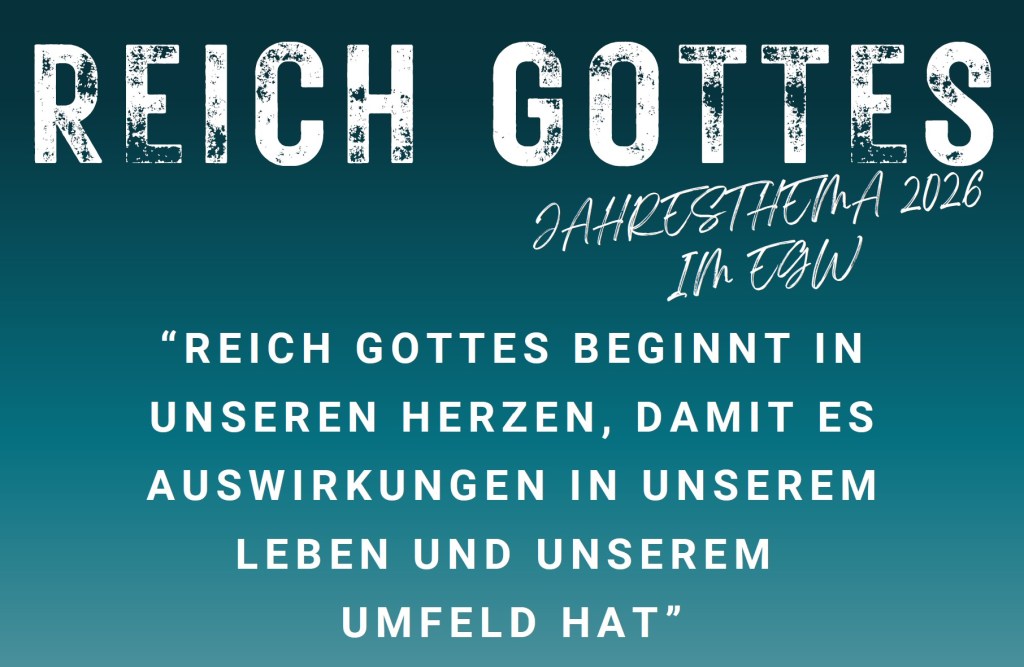 Zum Jahresthema 2026: Reich Gottes beginnt bei uns ganz persönlich. Gott wirkt aktuell sehr stark. Sind wir uns der Zurüstung durch Jesus bewusst? – Da wollen wir zusammen eintauchen, damit Reich Gottes auch durch uns in unserem Umfeld grosse Auswirkungen hat.